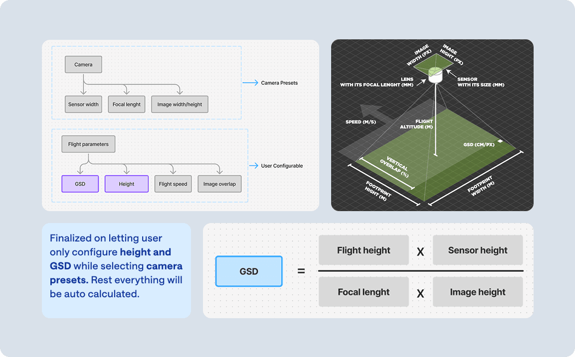 Technical feasability: In collaboration with the PM team, we focused on simplifying key parameter such as GSD, flight height, and image overlap and tackled the complex calculations early on. This proof of concept gave us confidence in the approach and provided greater clarity for designing the new planner